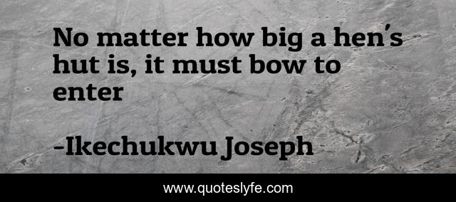 This page presents the quote "No matter how big a hen's hut is, it must bow to enter". Author of this quote is Ikechukwu Joseph. This quote is about proverbs, words-of-wisdom, wise-sayings,.