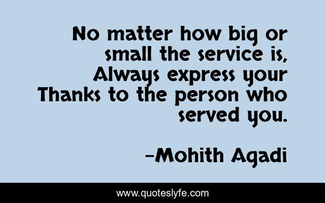 This page presents the quote "No matter how big or small the service is, Always express your Thanks to the person who served you.". Author of this quote is Mohith Agadi. This quote is about life, thank-you, thank, quotes, quote, thankful, thanks, quotes-by-mohith,.
