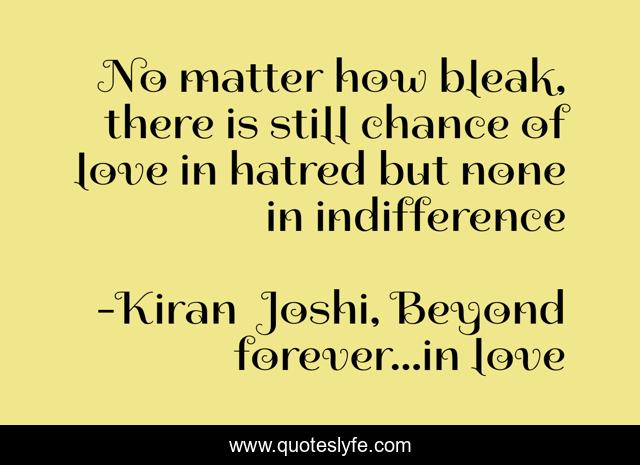 This page presents the quote "No matter how bleak, there is still chance of love in hatred but none in indifference". Author of this quote is Kiran Joshi, Beyond forever...in love. This quote is about heart, love, debut-book, beyondforeverinlove, kiranjoshi, book, unrequited-love, moving-on, affection,.