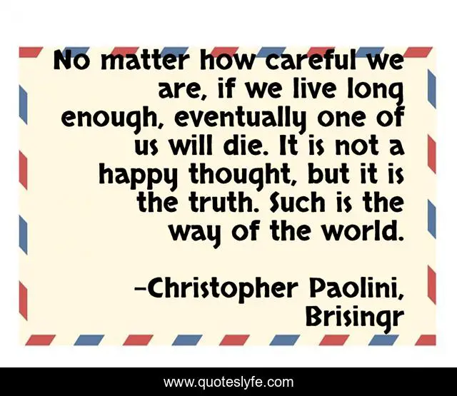 This page presents the quote "No matter how careful we are, if we live long enough, eventually one of us will die. It is not a happy thought, but it is the truth. Such is the way of the world.". Author of this quote is Christopher Paolini, Brisingr. This quote is about death, fate,.