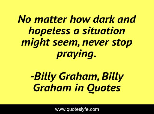 This page presents the quote "No matter how dark and hopeless a situation might seem, never stop praying.". Author of this quote is Billy Graham, Billy Graham in Quotes. This quote is about billy-graham, prayer,.