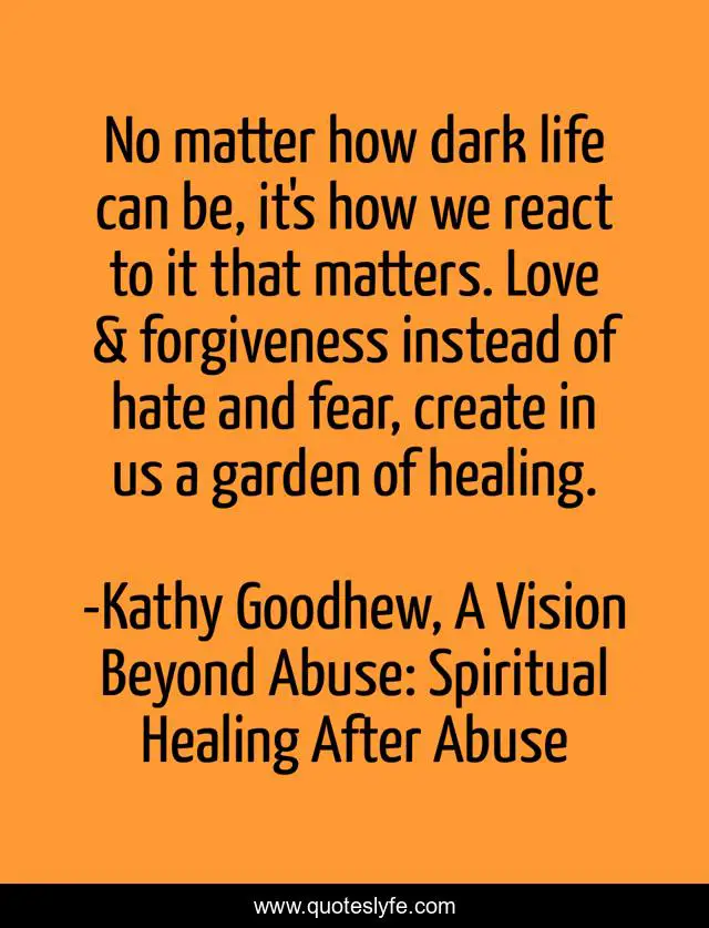 This page presents the quote "No matter how dark life can be, it's how we react to it that matters. Love & forgiveness instead of hate and fear, create in us a garden of healing.". Author of this quote is Kathy Goodhew, A Vision Beyond Abuse: Spiritual Healing After Abuse. This quote is about love, hope, inspirational, enthusiasm, forgiveness, affection,.