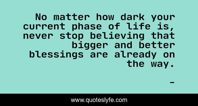 This page presents the quote "No matter how dark your current phase of life is, never stop believing that bigger and better blessings are already on the way.". Author of this quote is . This quote is about edmond-mbiaka, believe-in-the-blessings-ahead, bigger-and-better-blessings, believe-in-your-future-blessings,.
