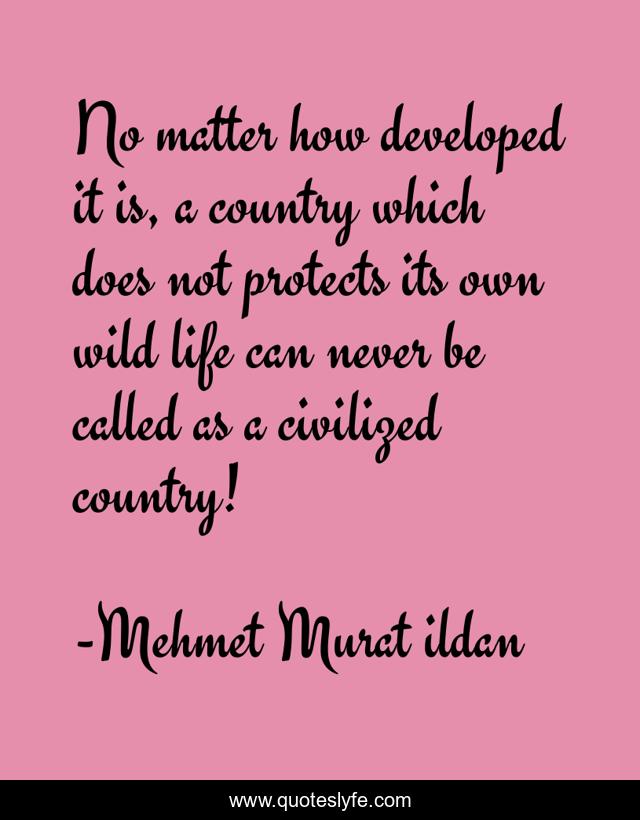 This page presents the quote "No matter how developed it is, a country which does not protects its own wild life can never be called as a civilized country!". Author of this quote is Mehmet Murat ildan. This quote is about civilized-society, ildan-wise-sayings, civilised-society, civilised, ildan-wisdom, country, turkish, turkish-playwrights, ildan-words,.