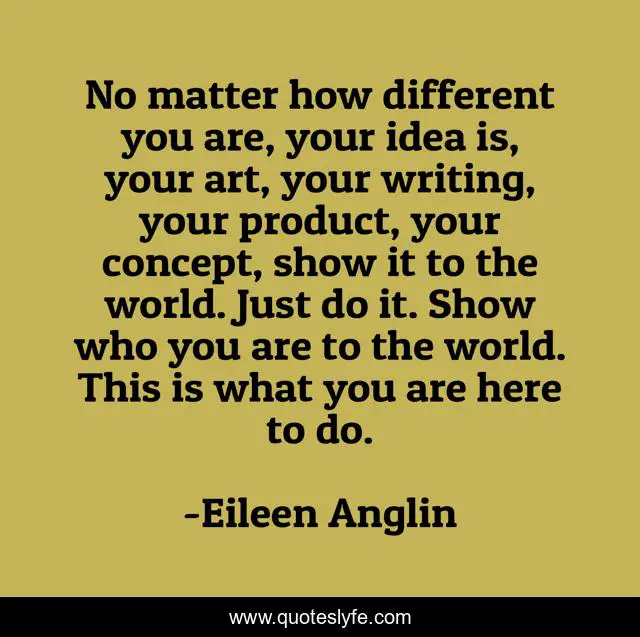 This page presents the quote "No matter how different you are, your idea is, your art, your writing, your product, your concept, show it to the world. Just do it. Show who you are to the world. This is what you are here to do.". Author of this quote is Eileen Anglin. This quote is about confidence, success, positive, motivational, optimistic, inspirational, enthusiasm,.