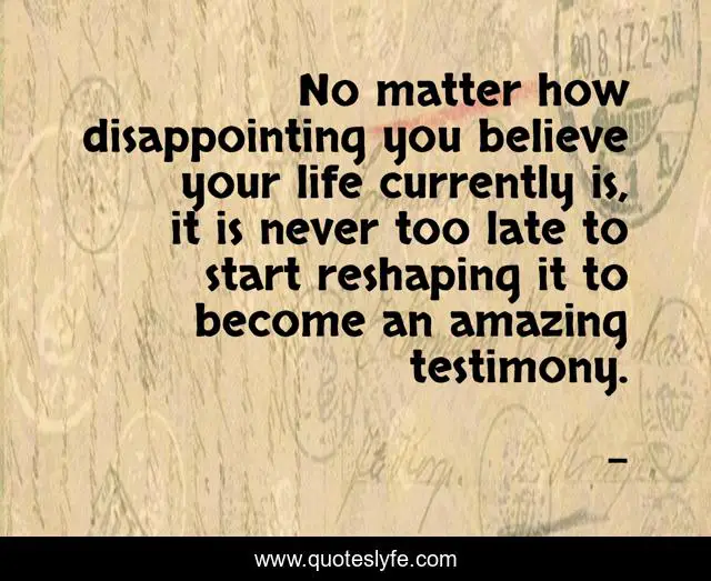 This page presents the quote "No matter how disappointing you believe your life currently is, it is never too late to start reshaping it to become an amazing testimony.". Author of this quote is . This quote is about edmond-mbiaka, turning-your-life-around, reshaping-your-life, reshape-your-life, turn-your-life-around-for-better,.