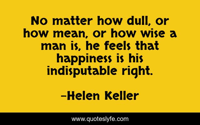 This page presents the quote "No matter how dull, or how mean, or how wise a man is, he feels that happiness is his indisputable right.". Author of this quote is Helen Keller. This quote is about man, wise, mean,.