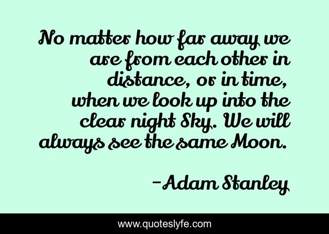 This page presents the quote "No matter how far away we are from each other in distance, or in time, when we look up into the clear night Sky. We will always see the same Moon.". Author of this quote is Adam Stanley. This quote is about love, affection, moon,.