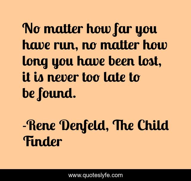 This page presents the quote "No matter how far you have run, no matter how long you have been lost, it is never too late to be found.". Author of this quote is Rene Denfeld, The Child Finder. This quote is about lost, love, runaway, affection,.