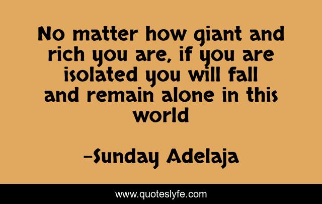 This page presents the quote "No matter how giant and rich you are, if you are isolated you will fall and remain alone in this world". Author of this quote is Sunday Adelaja. This quote is about jesus-christ, prosperity, giant, wealth, success, house, money, fall, riches,.