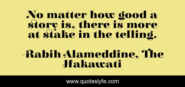 This page presents the quote "No matter how good a story is, there is more at stake in the telling.". Author of this quote is Rabih Alameddine, The Hakawati. .