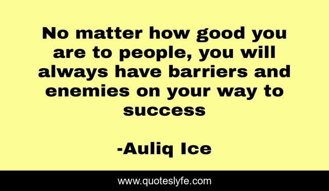 This page presents the quote "No matter how good you are to people, you will always have barriers and enemies on your way to success". Author of this quote is Auliq Ice. This quote is about succes, confidence, enemity, hard-work, positive, motivational, success, inspiarational, optimistic,.