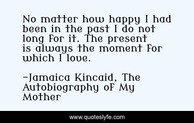 This page presents the quote "No matter how happy I had been in the past I do not long for it. The present is always the moment for which I love.". Author of this quote is Jamaica Kincaid, The Autobiography of My Mother. This quote is about past, life, present, time,.