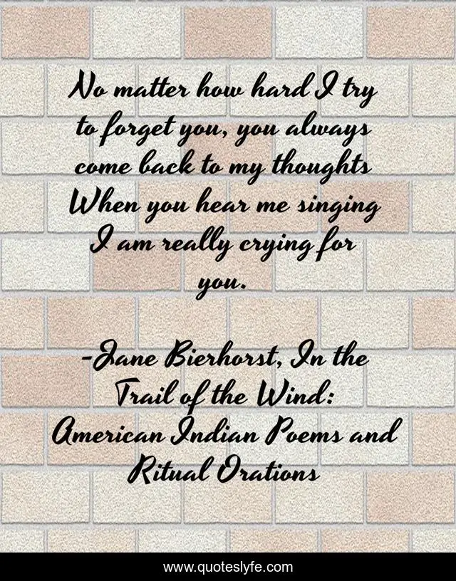 This page presents the quote "No matter how hard I try to forget you, you always come back to my thoughts When you hear me singing I am really crying for you.". Author of this quote is Jane Bierhorst, In the Trail of the Wind: American Indian Poems and Ritual Orations. This quote is about love, forget, native-american, poetry, hurt, makah, affection,.