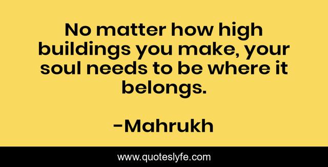 This page presents the quote "No matter how high buildings you make, your soul needs to be where it belongs.". Author of this quote is Mahrukh. This quote is about source, soul,.