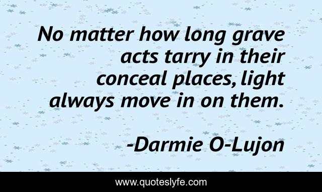 This page presents the quote "No matter how long grave acts tarry in their conceal places, light always move in on them.". Author of this quote is Darmie O-Lujon. This quote is about judgement, exposure,.