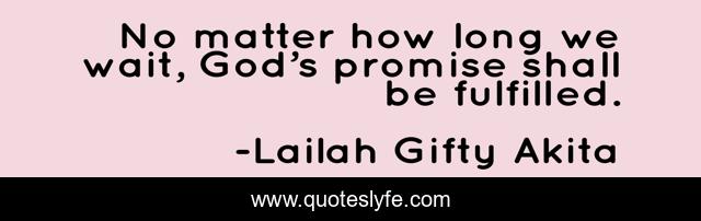 This page presents the quote "No matter how long we wait, God’s promise shall be fulfilled.". Author of this quote is Lailah Gifty Akita. This quote is about faith, confidence, positive, motivational, waiting, optimistic, god,.