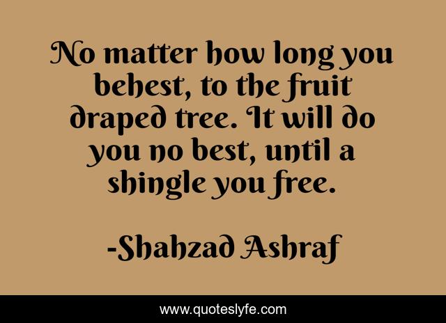 This page presents the quote "No matter how long you behest, to the fruit draped tree. It will do you no best, until a shingle you free.". Author of this quote is Shahzad Ashraf. This quote is about powerful-poetry, power, powerful, actions-over-words, begging, actions, forgiveness, war,.