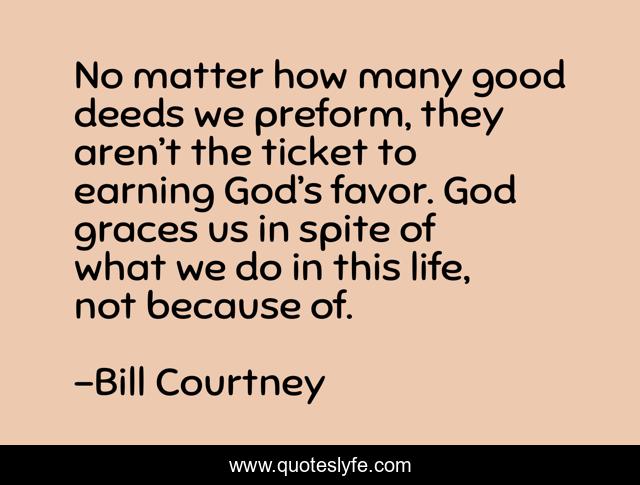 This page presents the quote "No matter how many good deeds we preform, they aren’t the ticket to earning God’s favor. God graces us in spite of what we do in this life, not because of.". Author of this quote is Bill Courtney. This quote is about earn, good, favor, god, deeds, life, matter, coach, passion,.
