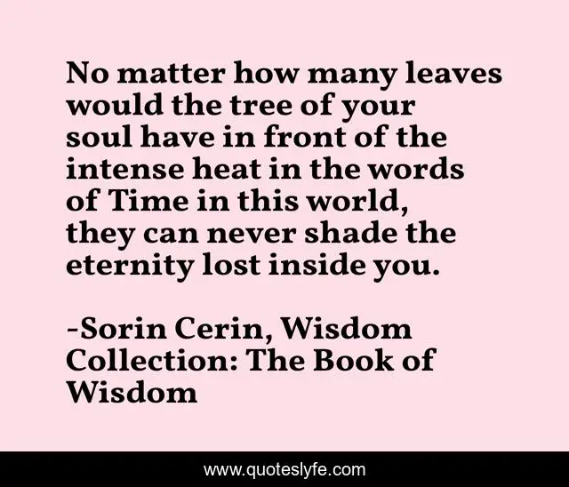 This page presents the quote "No matter how many leaves would the tree of your soul have in front of the intense heat in the words of Time in this world, they can never shade the eternity lost inside you.". Author of this quote is Sorin Cerin, Wisdom Collection: The Book of Wisdom. This quote is about eternity, love, soul, world, shadow, affection,.