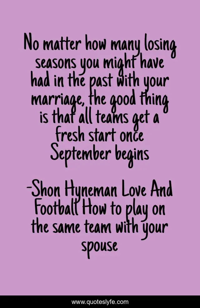 This page presents the quote "No matter how many losing seasons you might have had in the past with your marriage, the good thing is that all teams get a fresh start once September begins". Author of this quote is Shon Hyneman Love And Football How to play on the same team with your spouse. This quote is about losing, past, marriage, september, seasons,.