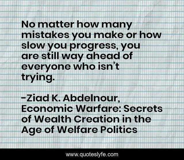 This page presents the quote "No matter how many mistakes you make or how slow you progress, you are still way ahead of everyone who isn’t trying.". Author of this quote is Ziad K. Abdelnour, Economic Warfare: Secrets of Wealth Creation in the Age of Welfare Politics. .