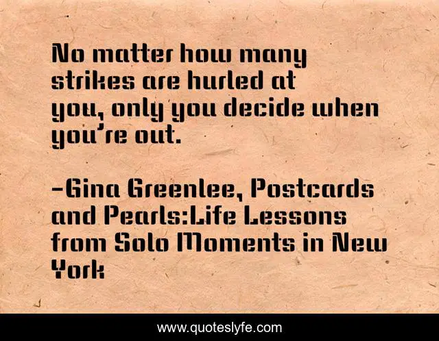 This page presents the quote "No matter how many strikes are hurled at you, only you decide when you’re out.". Author of this quote is Gina Greenlee, Postcards and Pearls:Life Lessons from Solo Moments in New York. This quote is about travel, new-york-city, new-york-travel, travel-writing, traveling,.