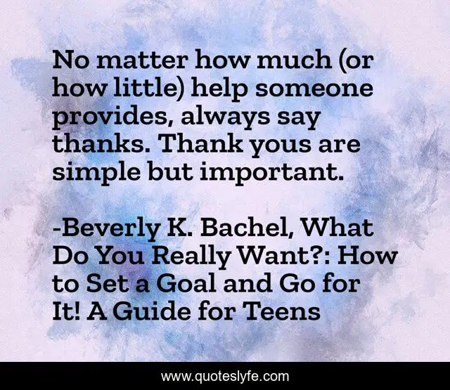 This page presents the quote "No matter how much (or how little) help someone provides, always say thanks. Thank yous are simple but important.". Author of this quote is Beverly K. Bachel, What Do You Really Want?: How to Set a Goal and Go for It! A Guide for Teens. This quote is about parenting, parenting-teens, nonfiction, inspirational, enthusiasm, nonfiction-self-help, young-adult, teens,.