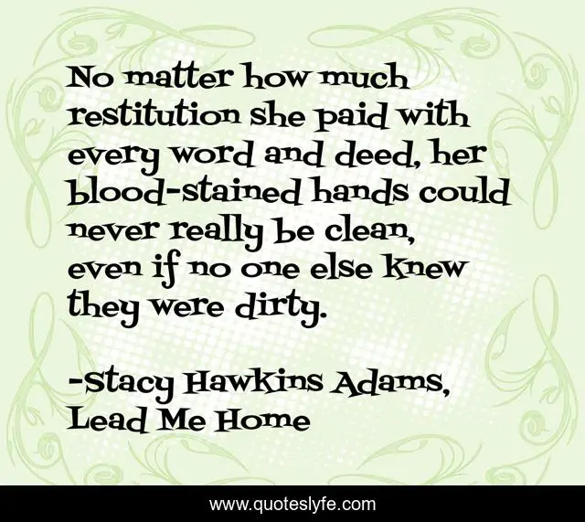 This page presents the quote "No matter how much restitution she paid with every word and deed, her blood-stained hands could never really be clean, even if no one else knew they were dirty.". Author of this quote is Stacy Hawkins Adams, Lead Me Home. This quote is about enthusiasm, novel, fictional-character, inspirational,.