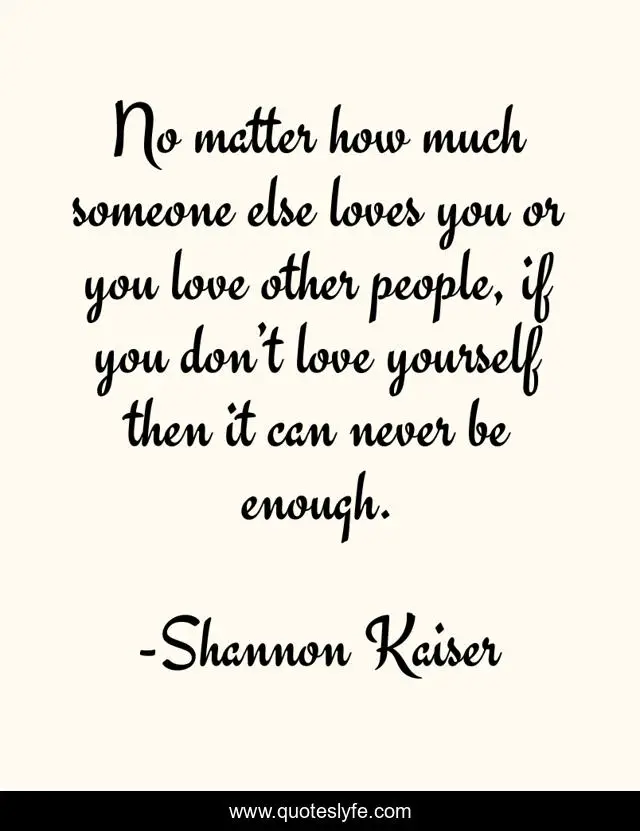 This page presents the quote "No matter how much someone else loves you or you love other people, if you don’t love yourself then it can never be enough.". Author of this quote is Shannon Kaiser. This quote is about love, people, peace, happiness, inspirational, self-help, enthusiasm, affection, happy,.