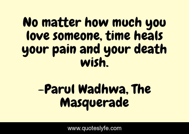 This page presents the quote "No matter how much you love someone, time heals your pain and your death wish.". Author of this quote is Parul Wadhwa, The Masquerade. This quote is about love-and-sayings, quote-of-the-day, heartbreak, quotes-to-live-by, quotes-about-life, life-philosophy, truth-of-life, the-masquerade,.