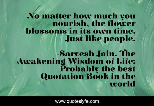This page presents the quote "No matter how much you nourish, the flower blossoms in its own time. Just like people.". Author of this quote is Sarvesh Jain, The Awakening Wisdom of Life: Probably the best Quotation Book in the world. .