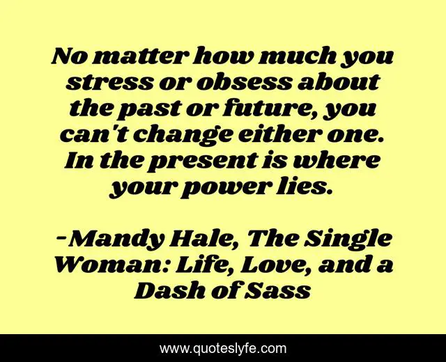 This page presents the quote "No matter how much you stress or obsess about the past or future, you can't change either one. In the present is where your power lies.". Author of this quote is Mandy Hale, The Single Woman: Life, Love, and a Dash of Sass. This quote is about the-future, over-analyzing, living-in-the-present, power-of-the-present-moment, power, the-single-woman, letting-go, acceptance, seize-the-day,.