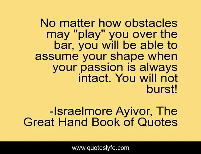 This page presents the quote "No matter how obstacles may "play" you over the bar, you will be able to assume your shape when your passion is always intact. You will not burst!". Author of this quote is Israelmore Ayivor, The Great Hand Book of Quotes. This quote is about burst, over, shape, obstacle, over-the-bar, intact, food-for-thought, rise-again, passion,.