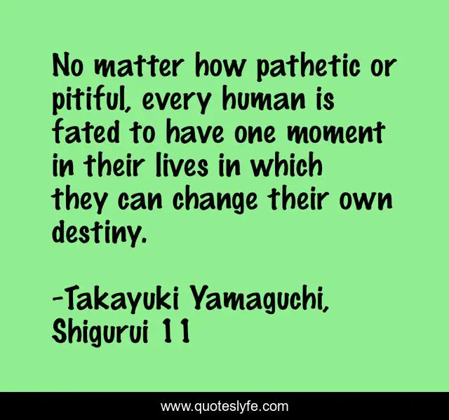 This page presents the quote "No matter how pathetic or pitiful, every human is fated to have one moment in their lives in which they can change their own destiny.". Author of this quote is Takayuki Yamaguchi, Shigurui 11. This quote is about equality, destiny, fate, rights, freedom, people, humanity, human-rights, worth,.