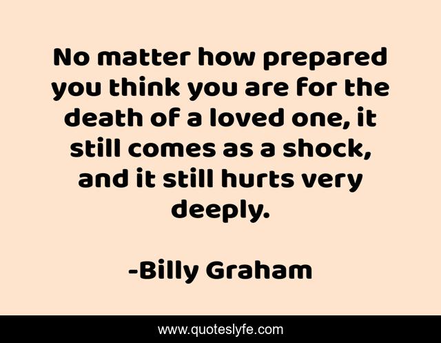 This page presents the quote "No matter how prepared you think you are for the death of a loved one, it still comes as a shock, and it still hurts very deeply.". Author of this quote is Billy Graham. This quote is about sympathy, think,.