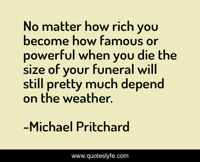 This page presents the quote "No matter how rich you become how famous or powerful when you die the size of your funeral will still pretty much depend on the weather.". Author of this quote is Michael Pritchard. This quote is about life, death,.