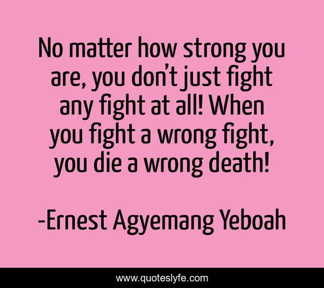 This page presents the quote "No matter how strong you are, you don’t just fight any fight at all! When you fight a wrong fight, you die a wrong death!". Author of this quote is Ernest Agyemang Yeboah. This quote is about mind-your-life, think-well, character, choices, strength-and-courage, fight-a-good-fight, what-is-worthy,.