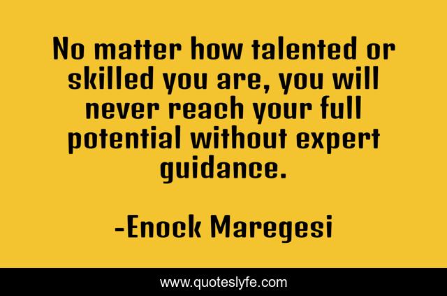 This page presents the quote "No matter how talented or skilled you are, you will never reach your full potential without expert guidance.". Author of this quote is Enock Maregesi. This quote is about talent, guidance, full-potential, potential, experts, expert-guidance, skill, dreams,.