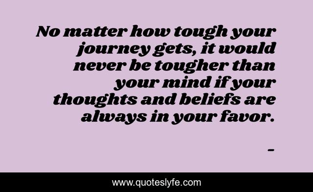 This page presents the quote "No matter how tough your journey gets, it would never be tougher than your mind if your thoughts and beliefs are always in your favor.". Author of this quote is . This quote is about tough-journey, tougher, edmond-mbiaka, your-journey, thoughts-and-beliefs, your-mind, your-thoughts,.