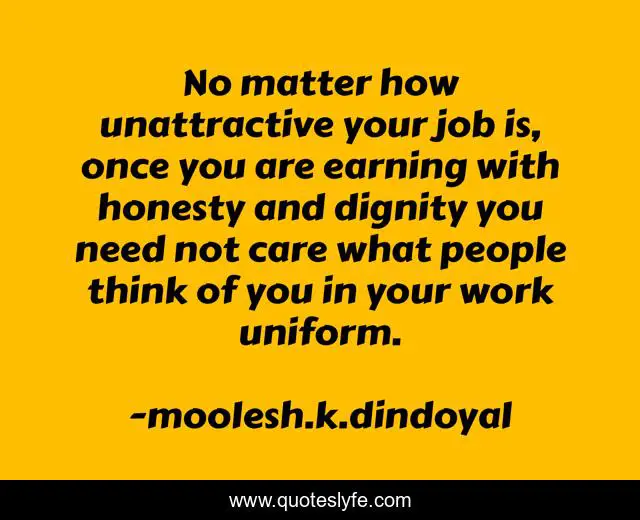 This page presents the quote "No matter how unattractive your job is, once you are earning with honesty and dignity you need not care what people think of you in your work uniform.". Author of this quote is moolesh.k.dindoyal. This quote is about dignity, job, work, honesty,.