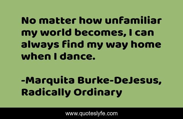 This page presents the quote "No matter how unfamiliar my world becomes, I can always find my way home when I dance.". Author of this quote is Marquita Burke-DeJesus, Radically Ordinary. This quote is about dance, significance,.