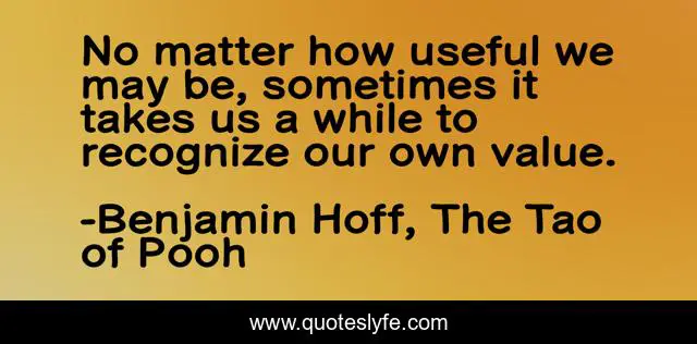 This page presents the quote "No matter how useful we may be, sometimes it takes us a while to recognize our own value.". Author of this quote is Benjamin Hoff, The Tao of Pooh. .
