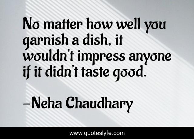This page presents the quote "No matter how well you garnish a dish, it wouldn't impress anyone if it didn't taste good.". Author of this quote is Neha Chaudhary. This quote is about inside, outside, personality,.