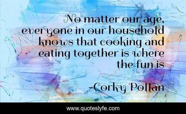 This page presents the quote "No matter our age, everyone in our household knows that cooking and eating together is where the fun is". Author of this quote is Corky Pollan. This quote is about cooks, cooking, foodie, ingredients, food, recipes, pollanfamilytable, homecookng, corky-pollan,.