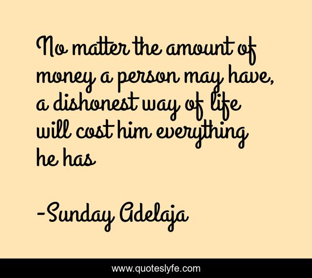 This page presents the quote "No matter the amount of money a person may have, a dishonest way of life will cost him everything he has". Author of this quote is Sunday Adelaja. This quote is about prosperity, life, wealth, person, money, dishonest, dishonest-way-of-life, matter, amount,.