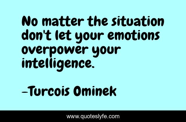This page presents the quote "No matter the situation don't let your emotions overpower your intelligence.". Author of this quote is Turcois Ominek. This quote is about self-awareness, intelligence, self, emotions, self-control, anger,.