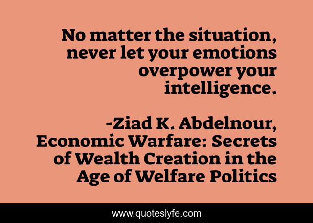 This page presents the quote "No matter the situation, never let your emotions overpower your intelligence.". Author of this quote is Ziad K. Abdelnour, Economic Warfare: Secrets of Wealth Creation in the Age of Welfare Politics. This quote is about intelligence, emotions,.