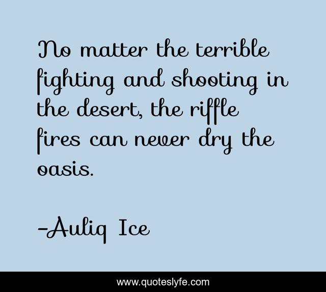 This page presents the quote "No matter the terrible fighting and shooting in the desert, the riffle fires can never dry the oasis.". Author of this quote is Auliq Ice. This quote is about anger, anger-management, argumentative, arguments, peac,.