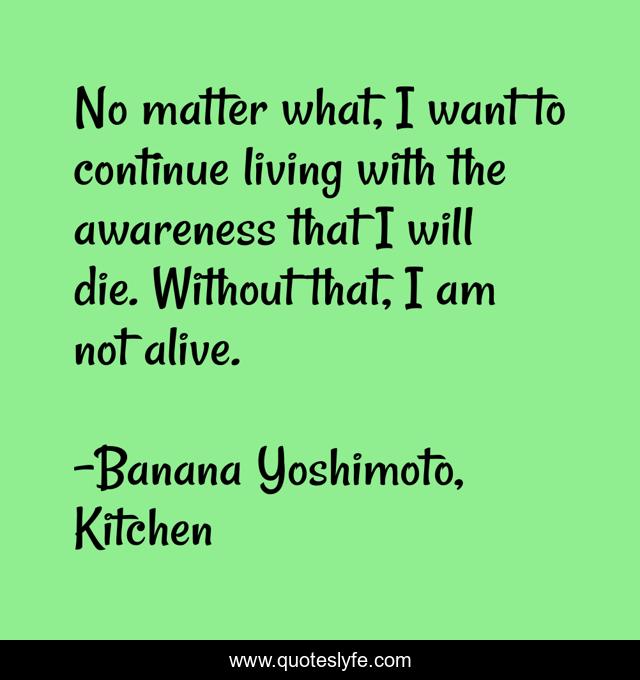 This page presents the quote "No matter what, I want to continue living with the awareness that I will die. Without that, I am not alive.". Author of this quote is Banana Yoshimoto, Kitchen. .